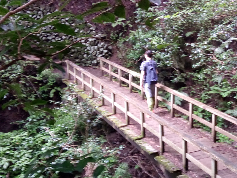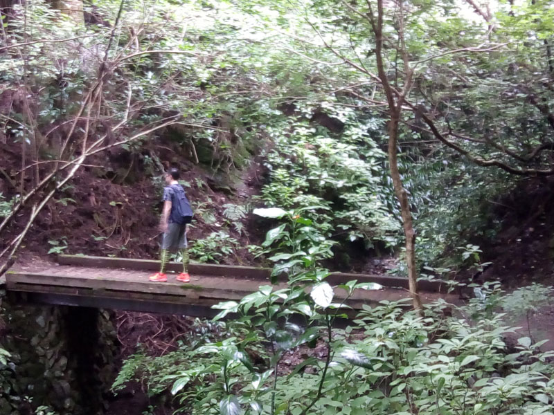 靴はスニーカーで十分ですが道は土の道幅の狭い登山道で擦れ違うのにも足下に注意が必要です。