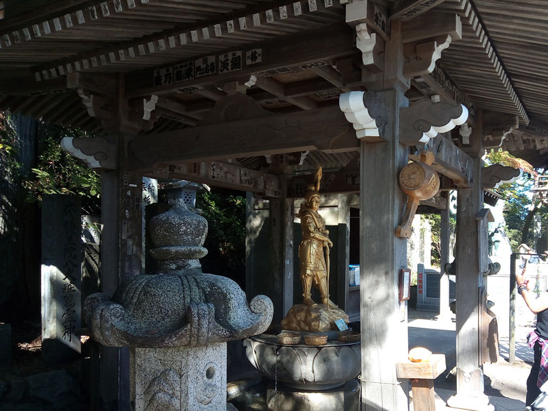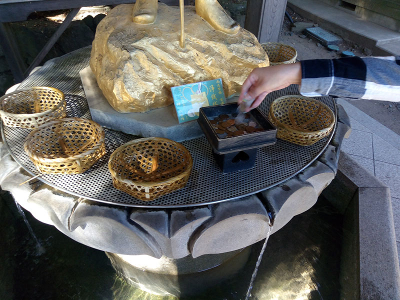 八大龍王を祭るお堂です。仏法を守護する天龍八部衆の一人で、福寿・円満の神様です。 足元に流れる水でお金を清めると願いが叶いお金が増えるとか、そのためお金を洗うザルが借りられます。 清めたお金を納めるお守り袋は、お札授与所で頒布されます。
